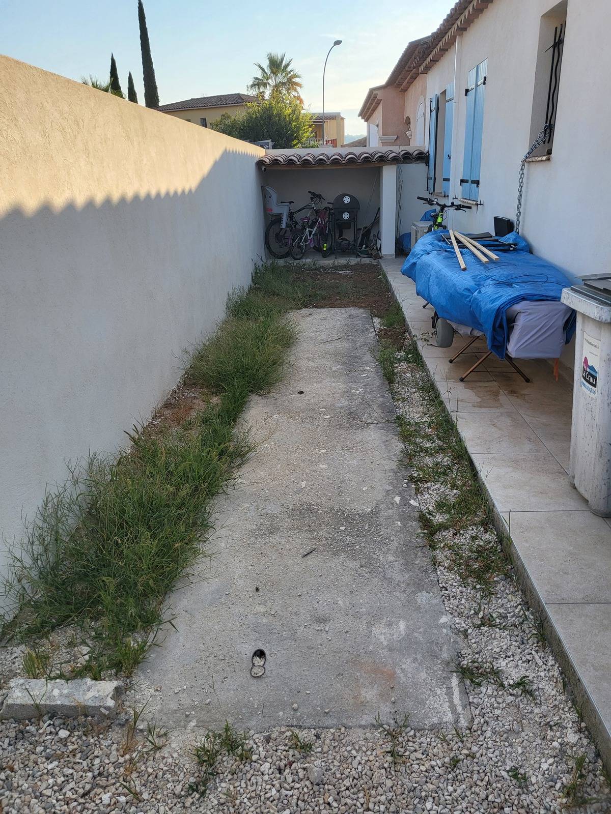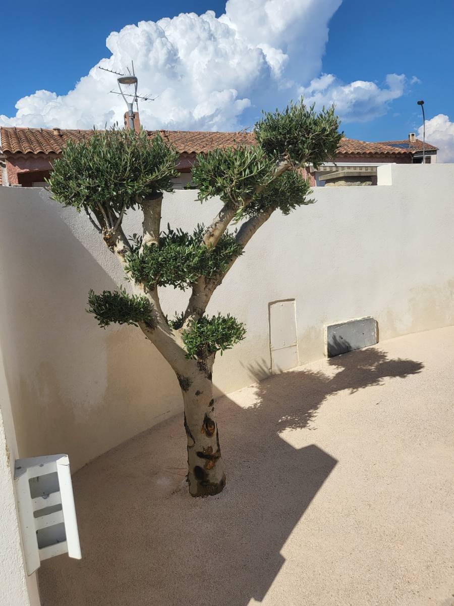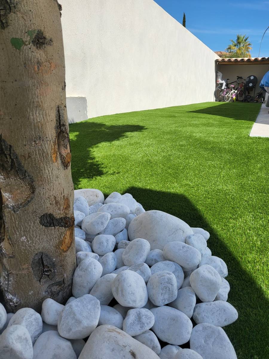 Notre entreprise Les Jardins de Laurent vous présente l’une de ses dernières réalisations paysagères : un aménagement de jardin avec la pose d’un gazon artificiel et la plantation d’un olivier bonsaï à La Crau dans le 83.