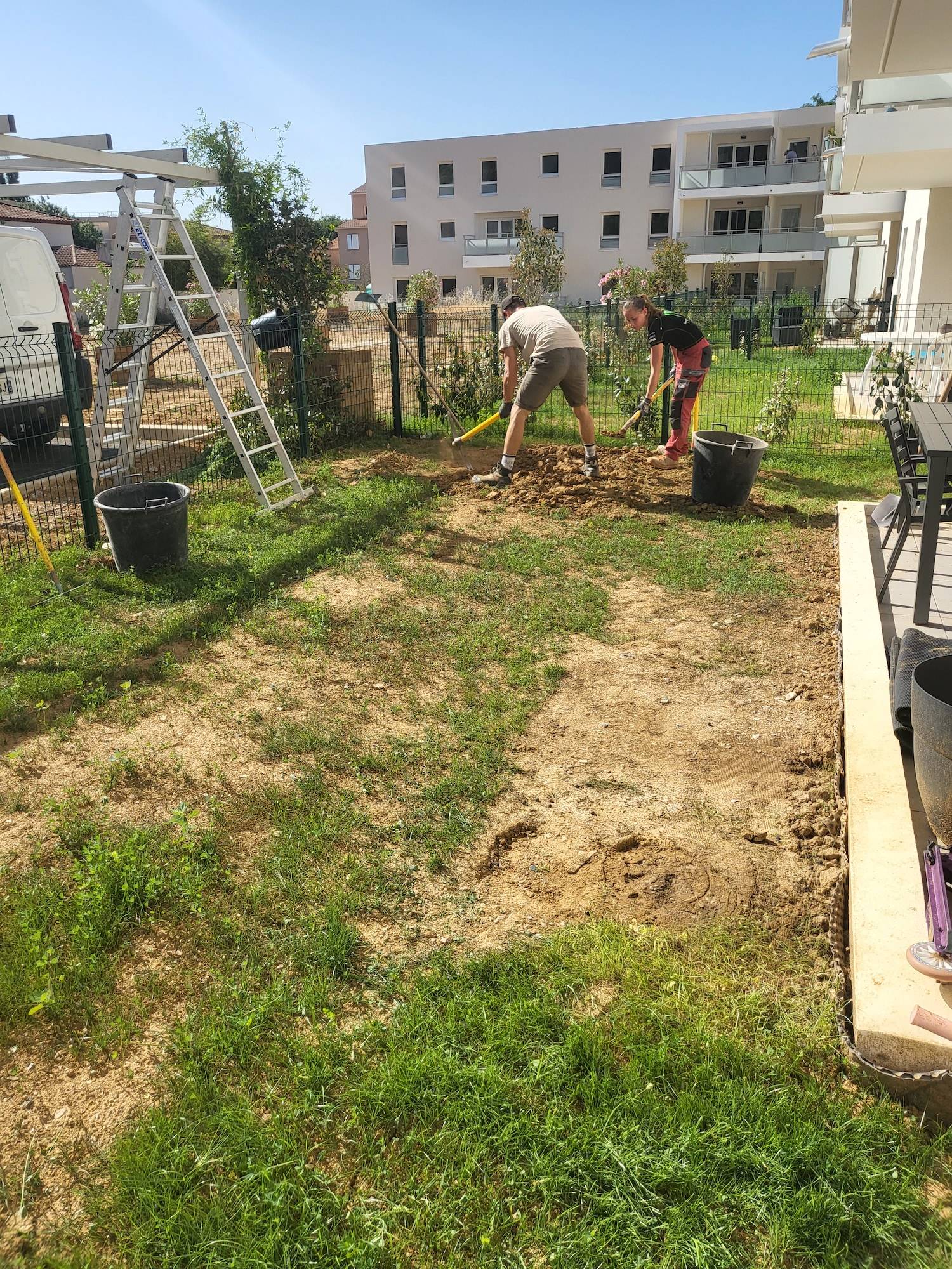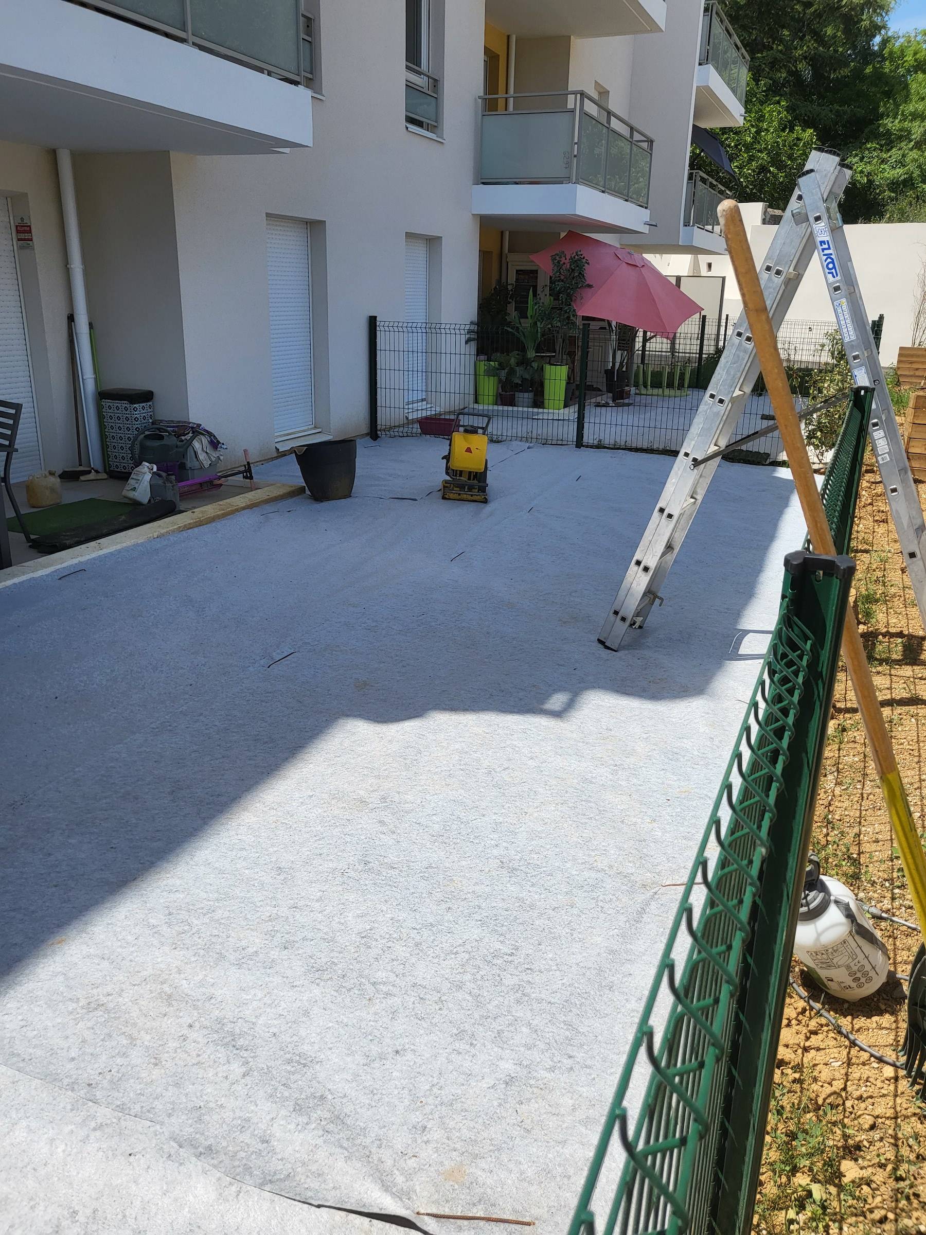 Pour mettre en œuvre cet aménagement, notre équipe a préparé le sol avec la pose de géotextile perpendiculairement aux lés pour éviter la repousse de l’herbe, puis ajouté un lit de sable concassé et égalisé.