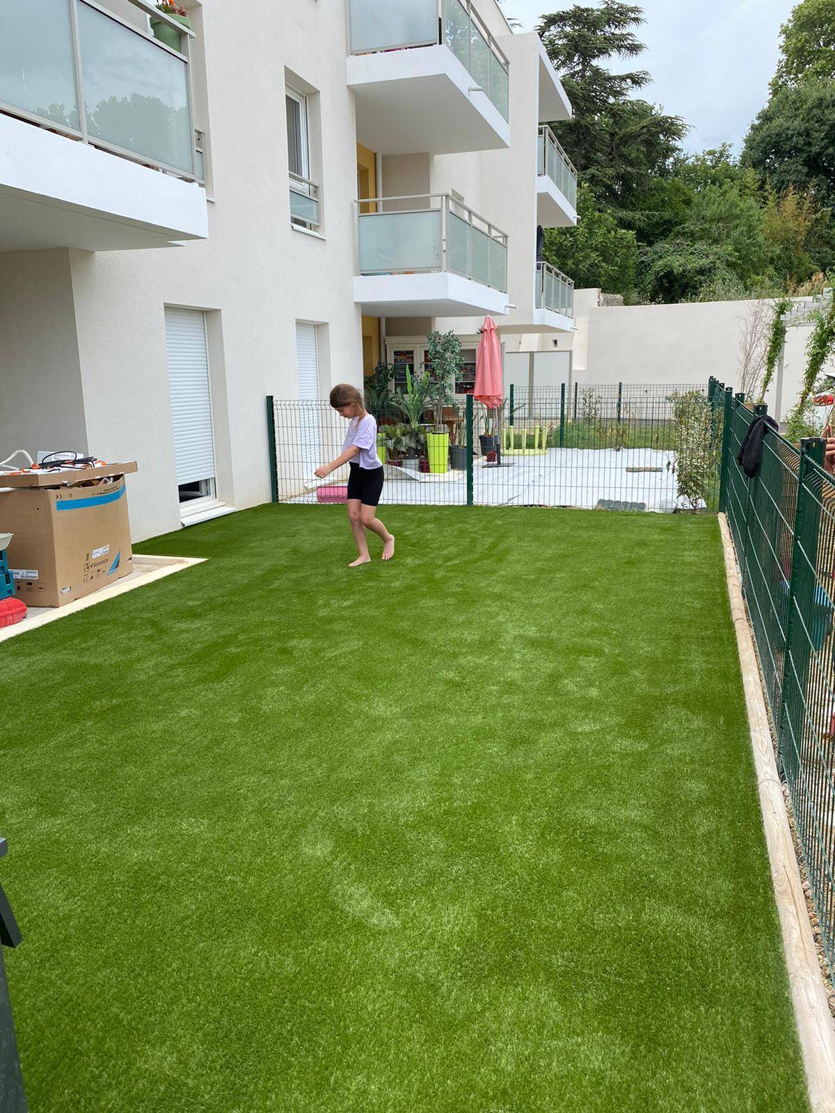 En prolongement de leurs terrasses, ces propriétaires ont choisi d’habiller leurs jardinets privatifs d’une pelouse artificielle pour de multiples raisons :