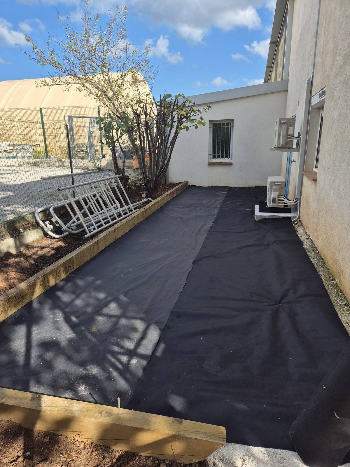 Devant la jardinière, nous avons posé une bâche géotextile pour éviter la repousse des mauvaises herbes et nous l’avons recouverte de galets de Vergèze.