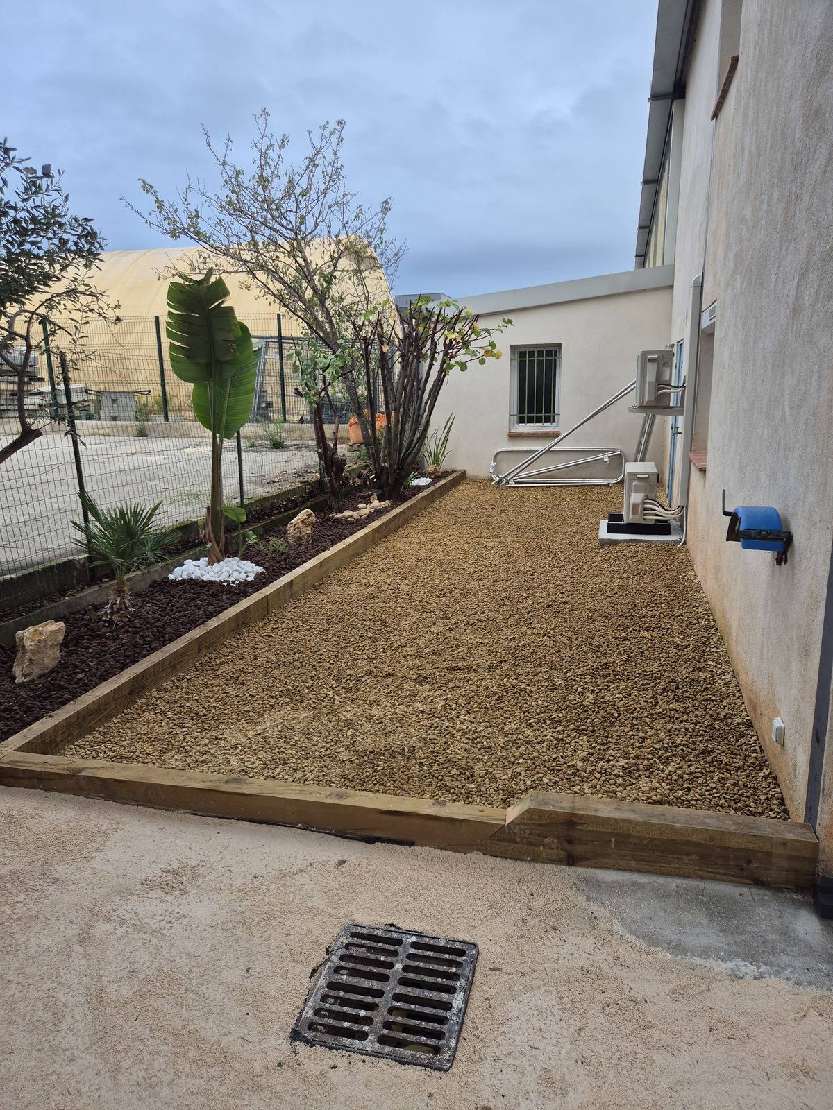 Dans un second temps nous avons créé une jardinière le long de la clôture de cet entrepôt. Nous l’avons délimité à l’aide de traverses paysagères en pin puis nous avons réalisé un apport de terre afin d’y effectuer différentes plantations. Pour obtenir un résultat soigné, nous avons ensuite recouvert l’intégralité de la surface de la jardinière avec divers minéraux : de la pouzzolane mais aussi quelques galets au pied de certaines plantations et des pierres décoratives.