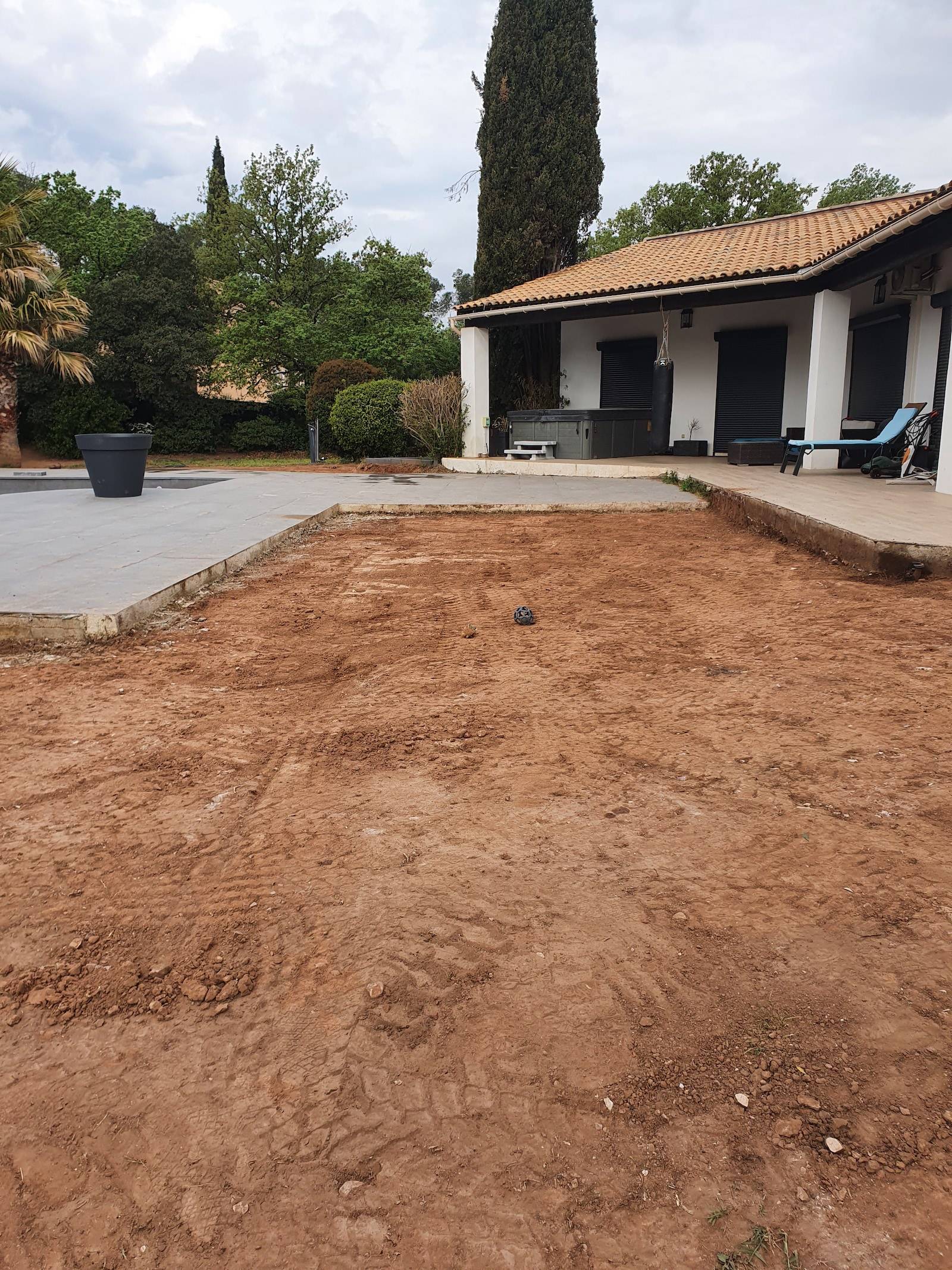 Sur les 300 m2 concernés, nous avons fait des travaux de préparation du sol : désherbage à raz et de damage pour une surface plane.