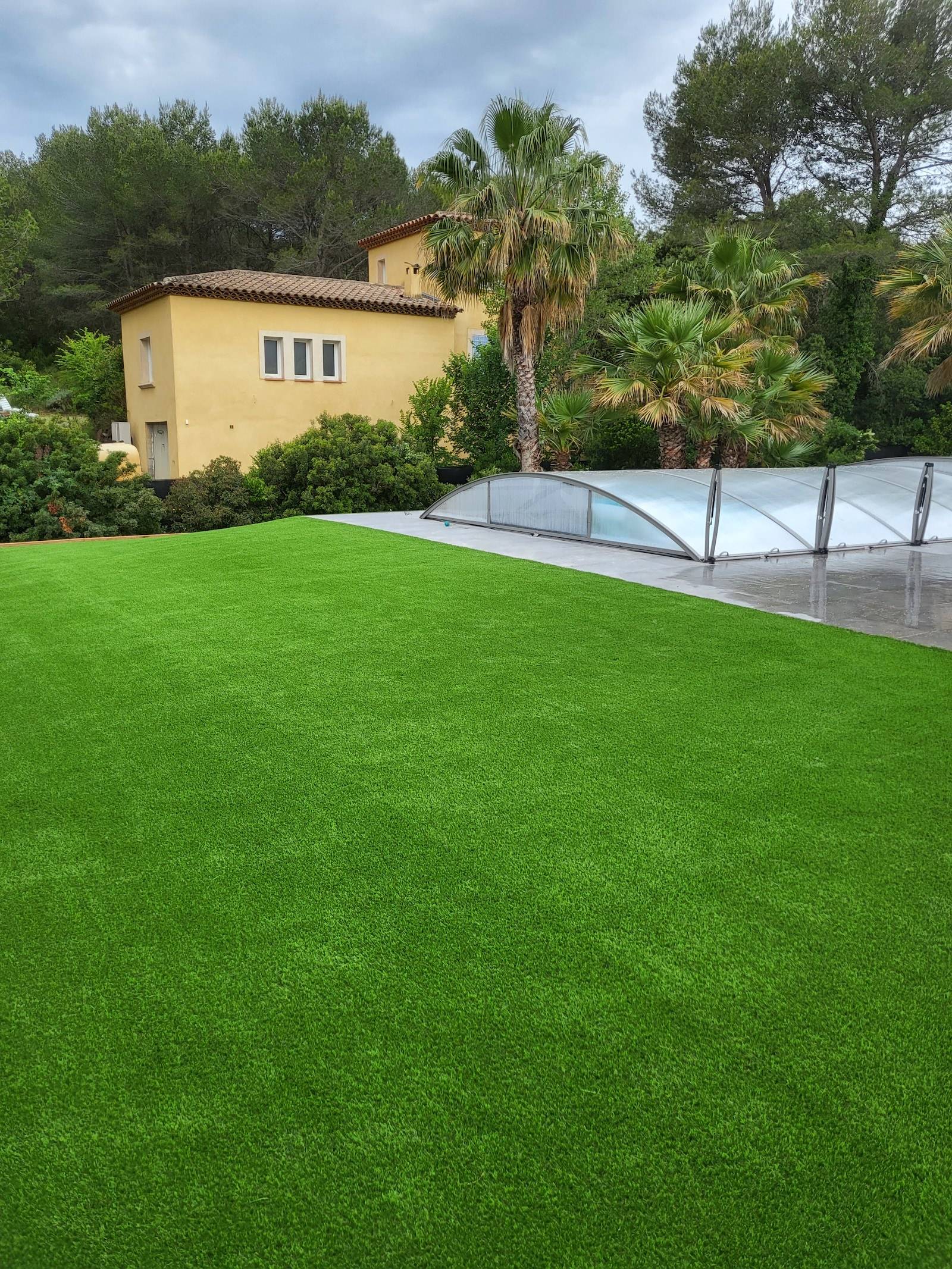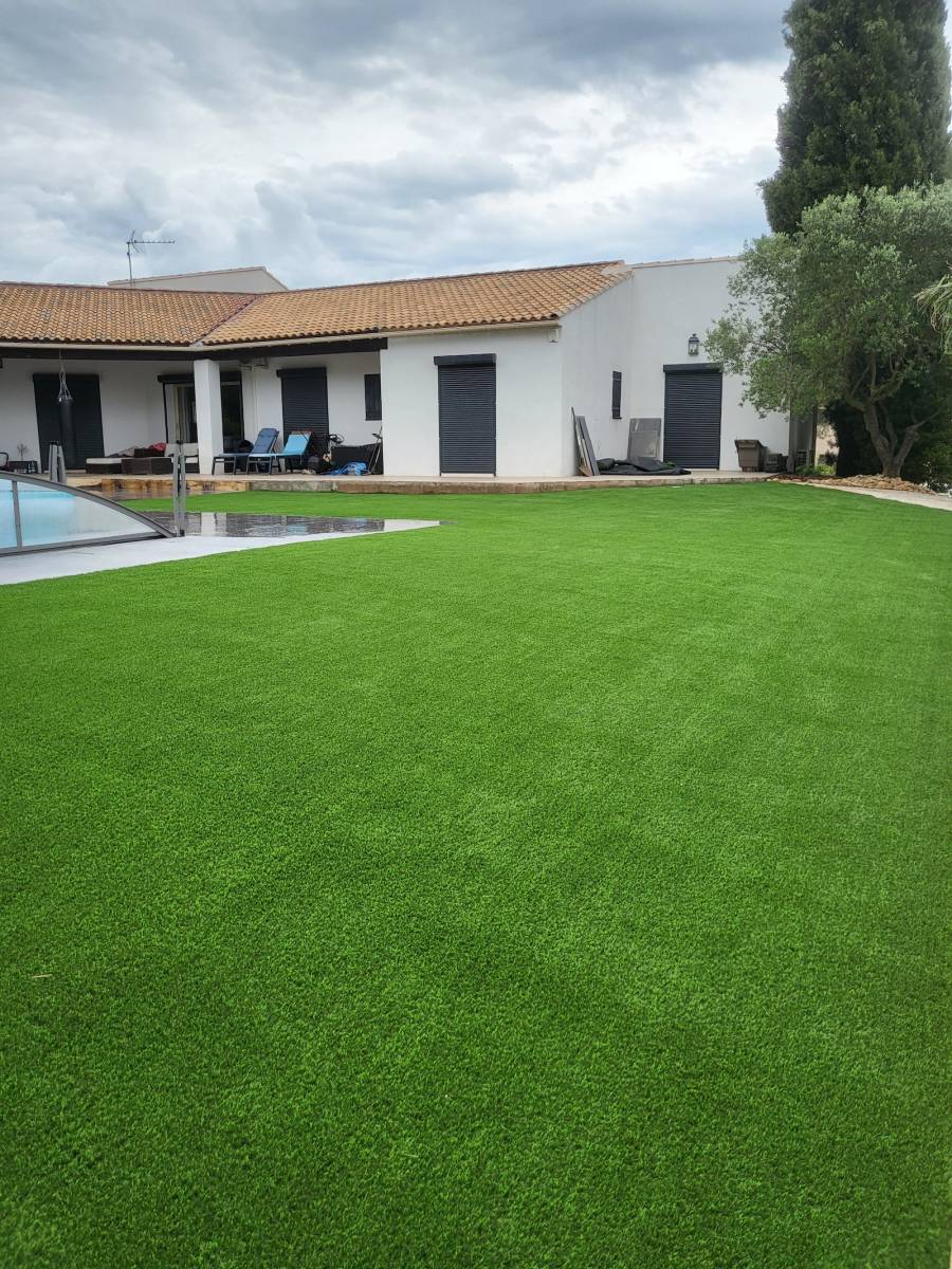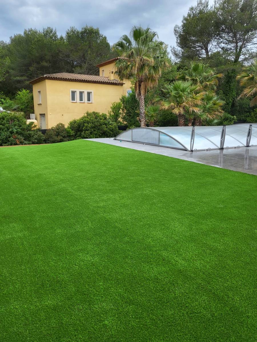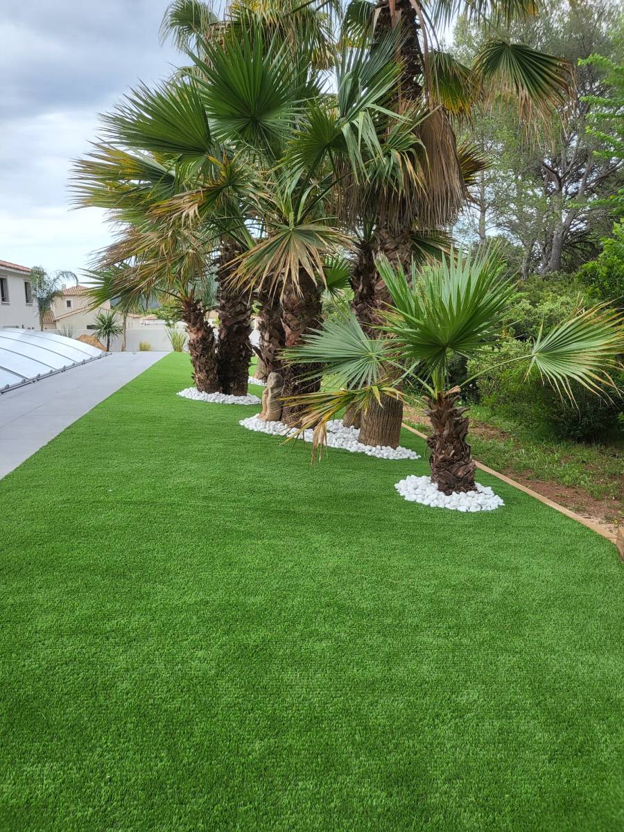 Les Jardins de Laurent, artisan paysagiste expérimenté, vous présente un aménagement paysager de 300 m2 avec du faux gazon à La Crau Var.