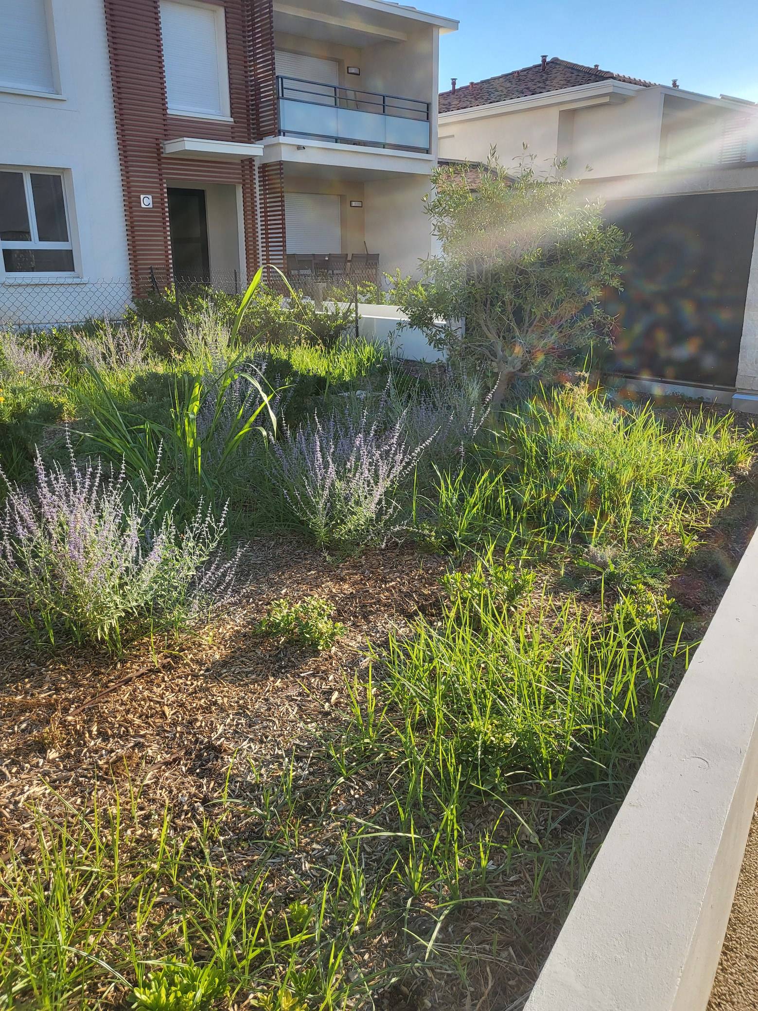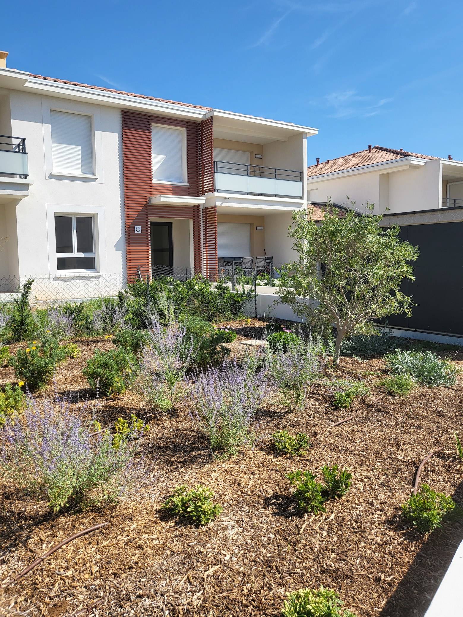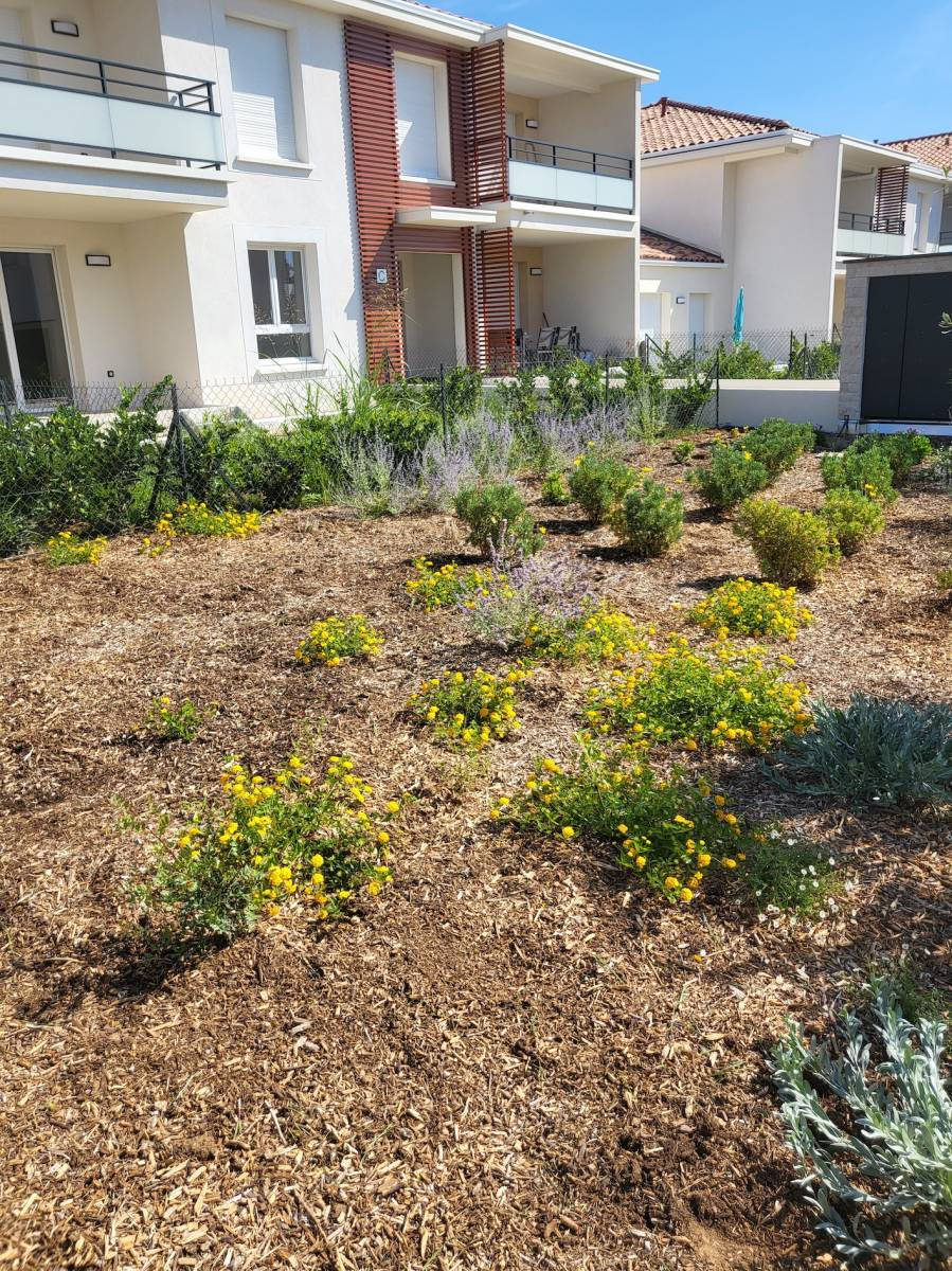 Un désherbage manuel ou mécanique permet de garder propre les différents massifs, d’aérer les pieds des arbustes et des végétaux de manière à favoriser leur croissance, comme c’est le cas pour les espaces verts de cet immeuble récent.