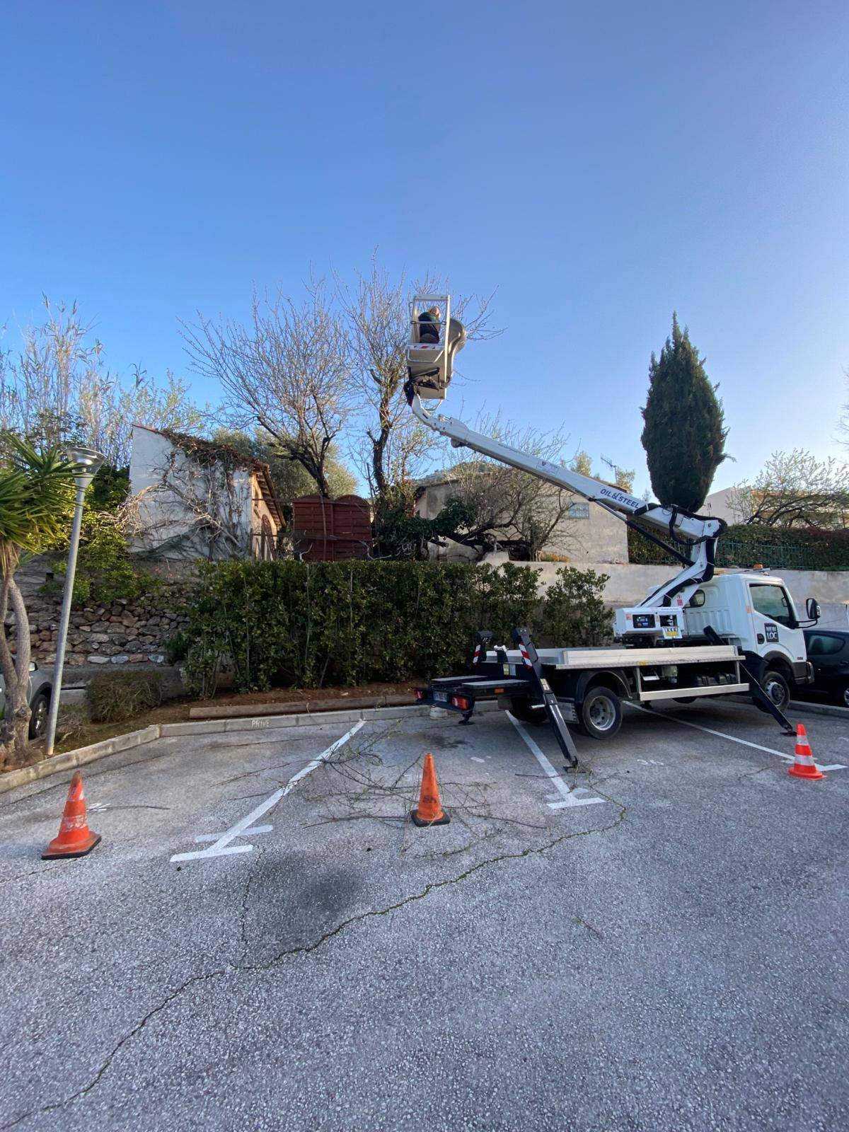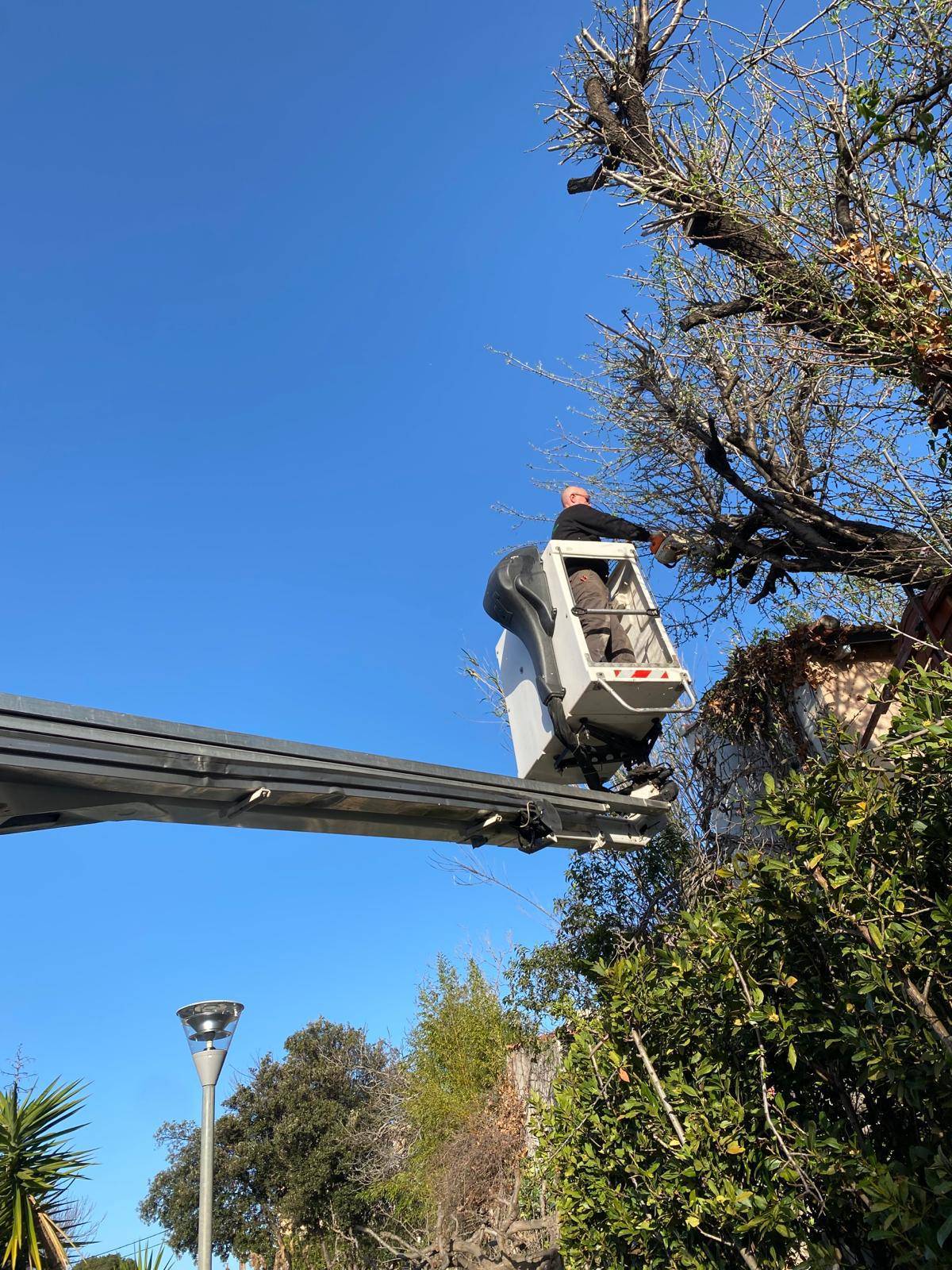 L’arbre étant inaccessible, nous sommes intervenus à l’aide d’un camion nacelle afin de pouvoir accéder aux branches de l’arbre à élaguer.