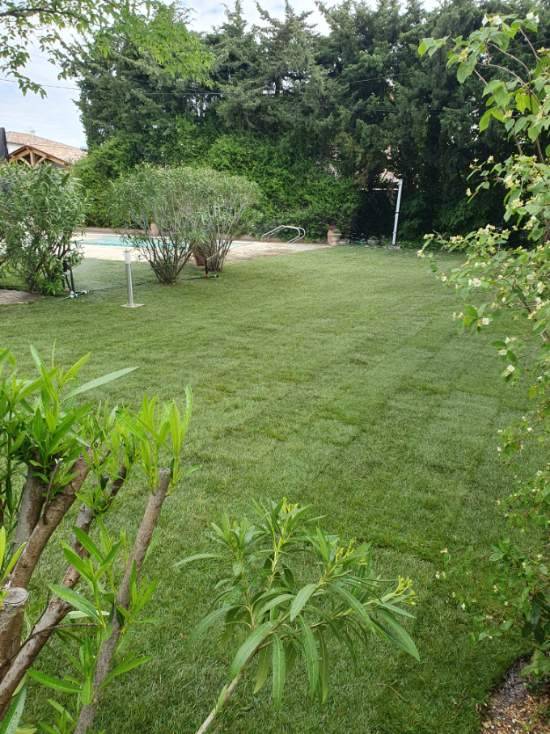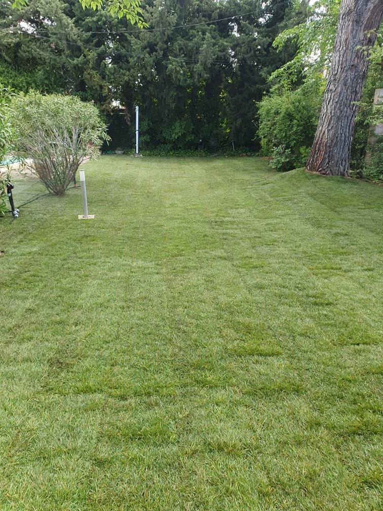 Pour ce terrain fortement exposé à la chaleur à La Crau (83), nos jardiniers experts ont effectué une pose de 200 m2 de gazon naturel en rouleau composé de 3 variétés différentes.
