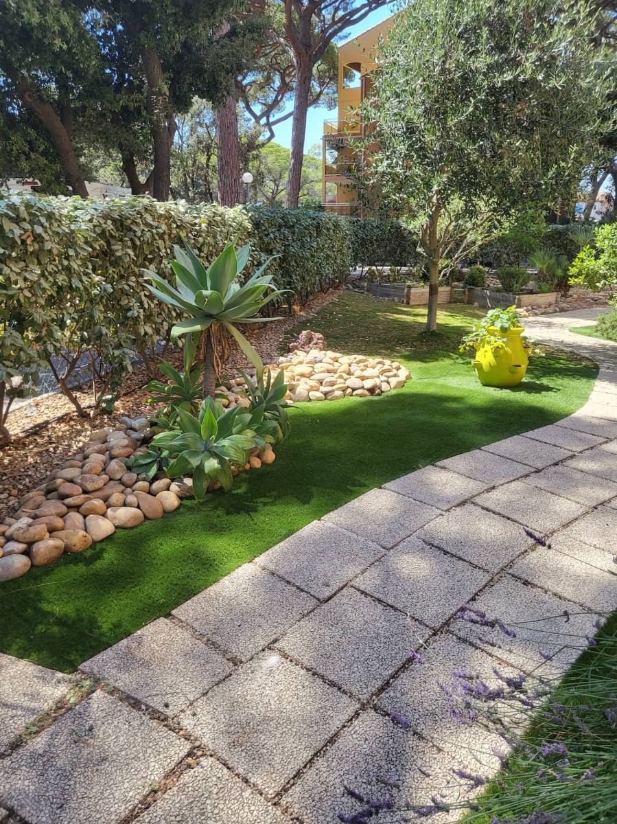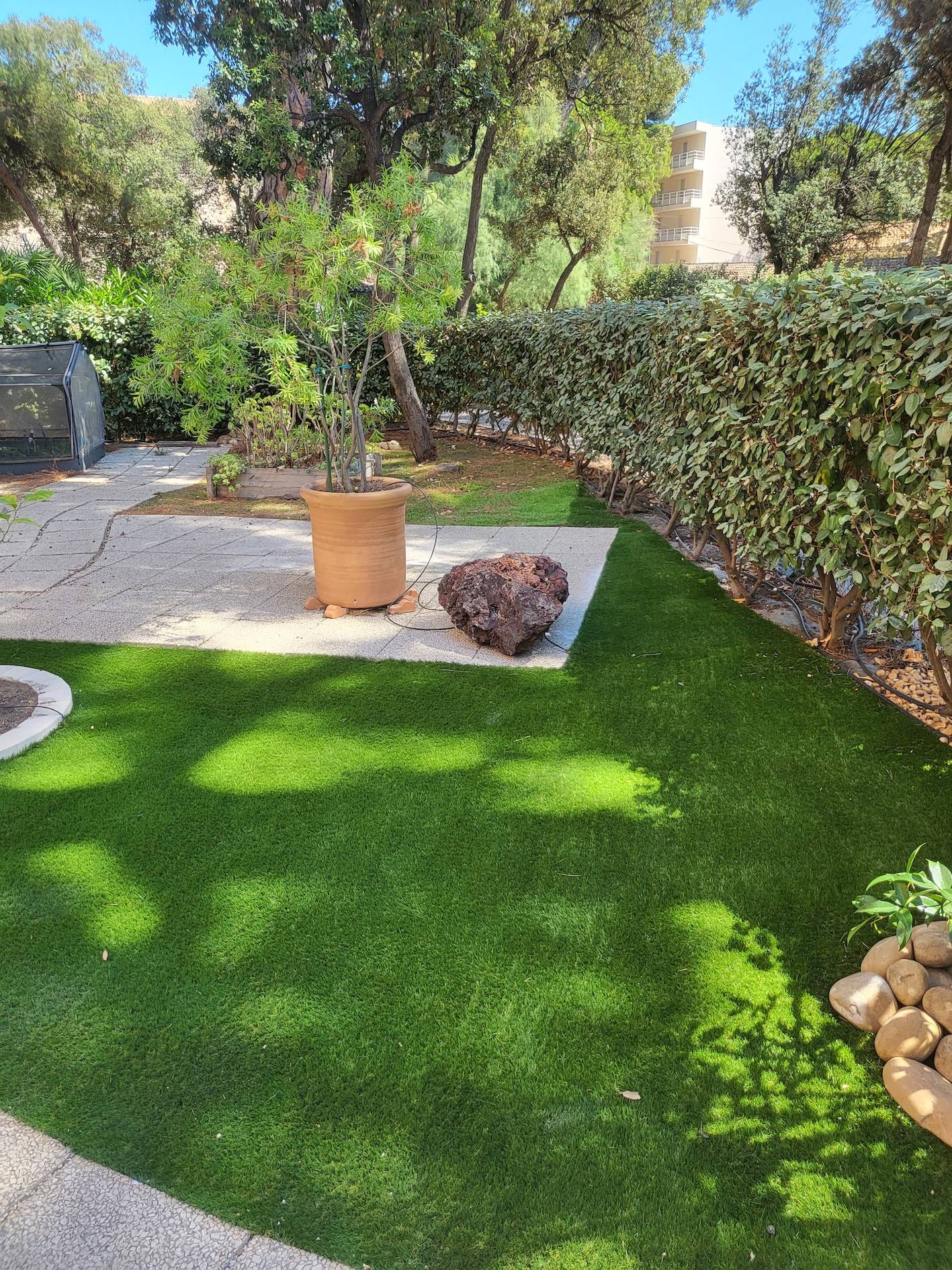 Pour un rez-de-jardin privatif situé dans une résidence à Hyères nous avons procédé à l'installation de 102m2 de pelouse synthétique pour mettre en valeur les plantes méditerranéennes et tropicales existantes.