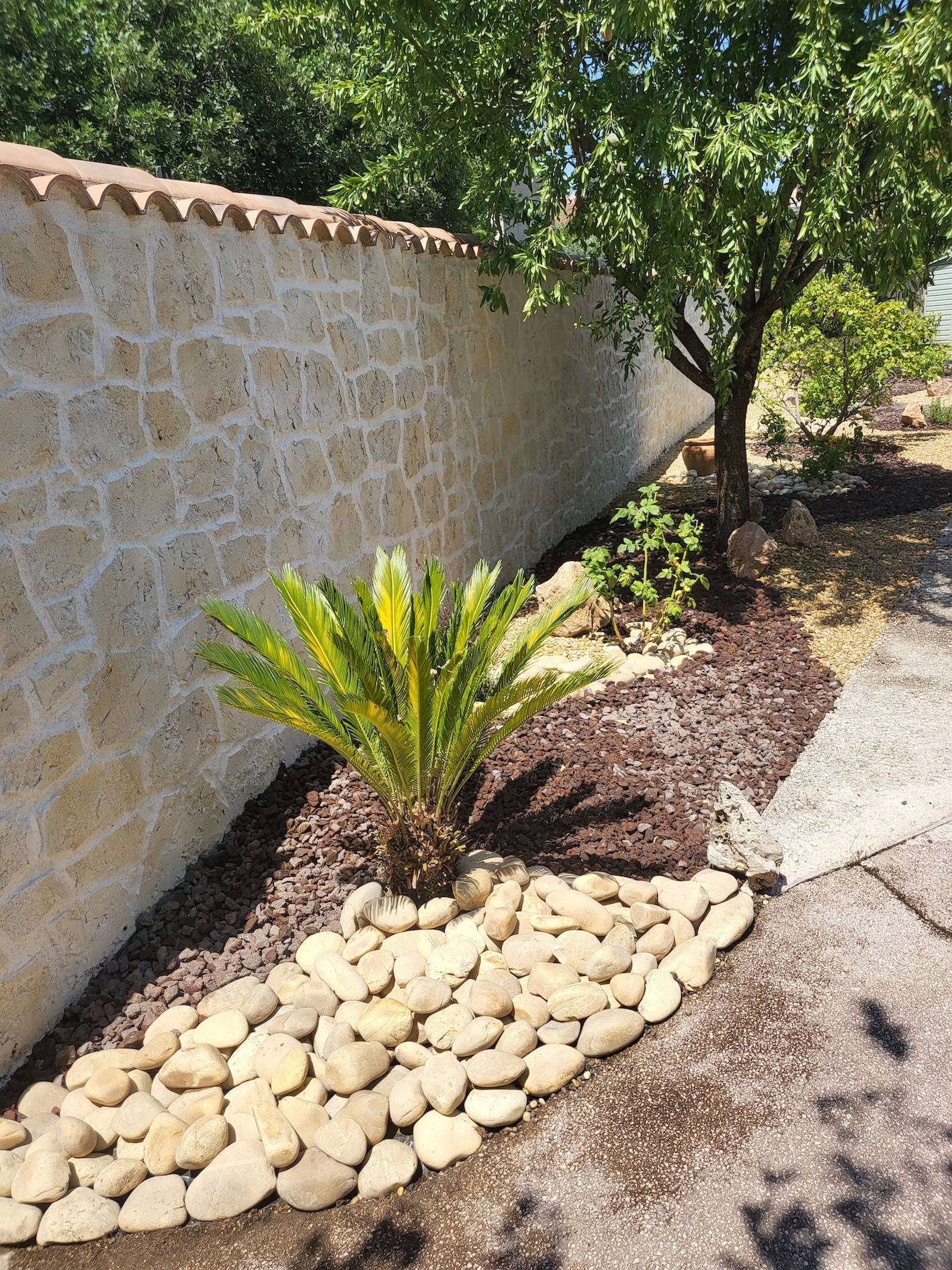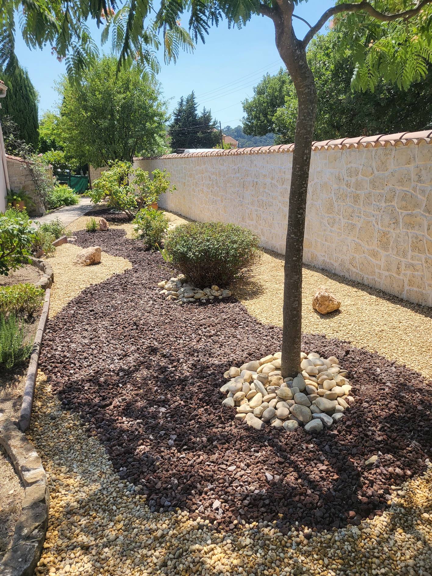 Pour mettre en valeur les arbres, arbustes et autres végétaux, nous avons changé les pierres décoratives afin d’apporter du contraste. L’ajout de différents minéraux, comme du gravier roulé jaune, des grandes pierres d’ornement, et des gros galets, permet de réaliser des effets de couleur et de volume au sol, recouvert à l’origine de Pouzzolane.