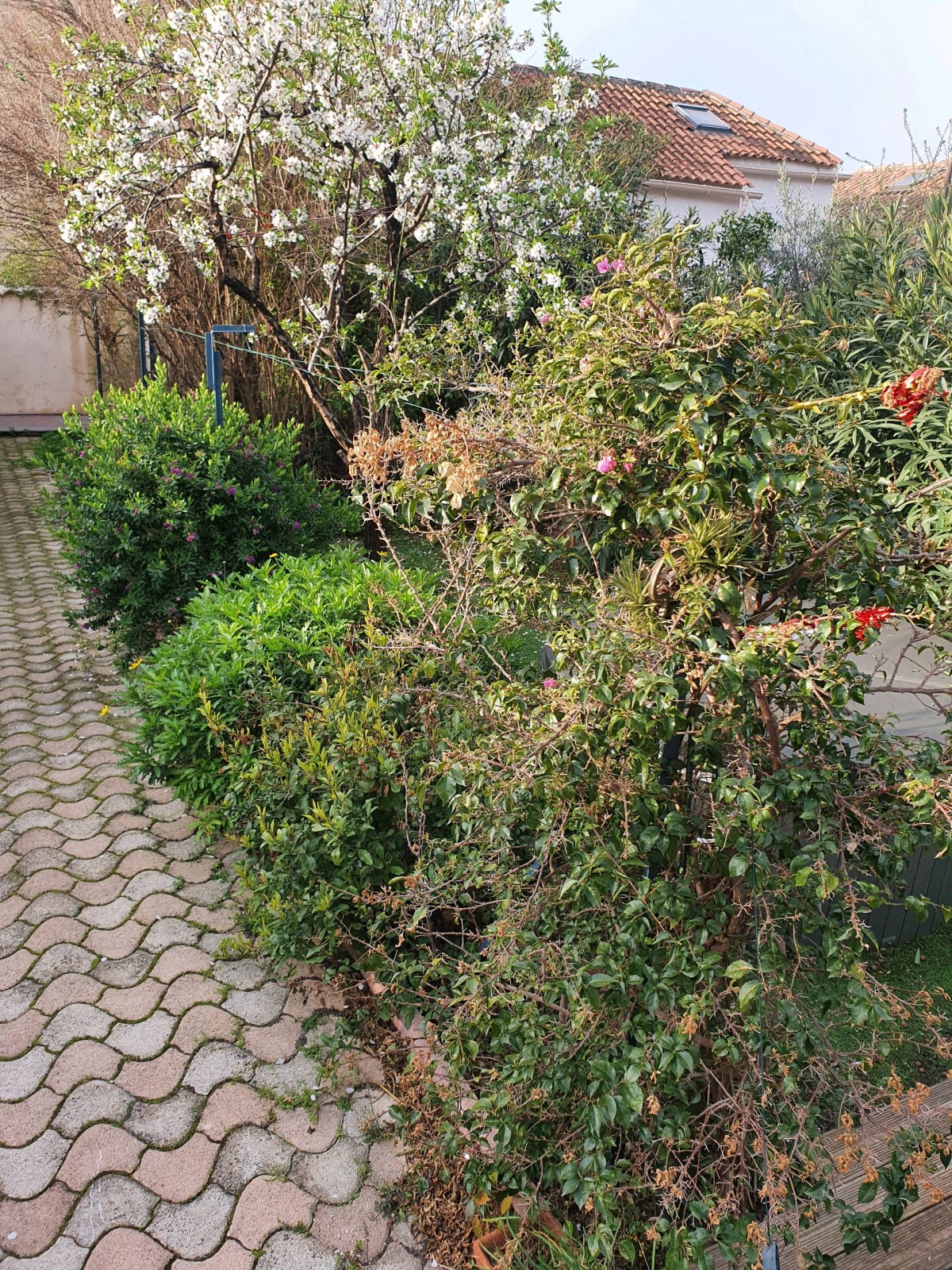 Nous avons effectué la taille des haies de Lauriers rose, le désherbage, le débroussaillage de la surface, et le ratissage complet, l'application du désherbant anti-germinatif et également l'évacuation complète de tous les déchets.
