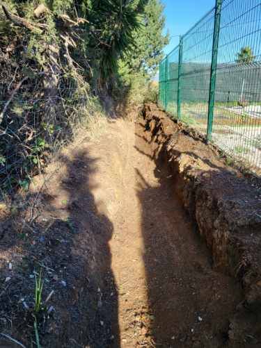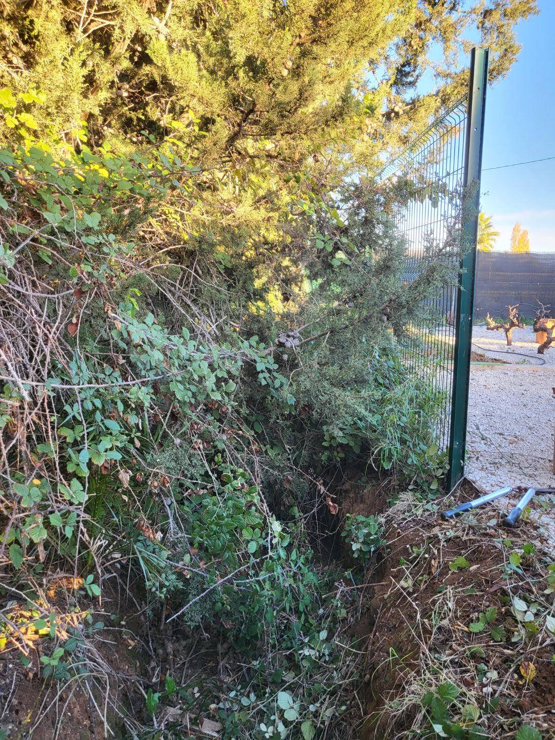 Ainsi, nous l’avons totalement dégagé afin que l’eau s’écoule sans difficulté. Pour cela, nous avons éliminé les ronces, élagué les branches de cyprès et procédé au nettoyage du sol avec l’enlèvement de tous déchets accumulés.